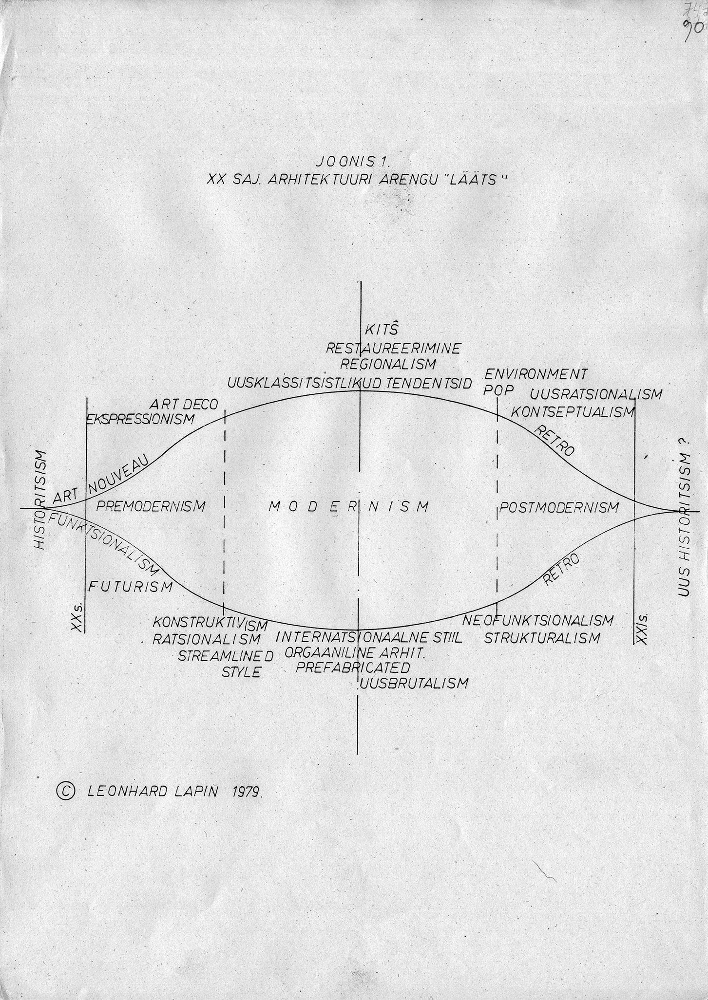 Esimesel joonisel laotab Lapin läätse kumerpindadele lahti 20. sajandi modernismiajaloo kunstivoolud ja vormiilmingud kahel paralleelselt kulgeval – art nouveau[2] ja funktsionalismi – rajal, mis 20. sajandi lõpuks suubuvad ühtlaseks retrosuundumuseks, mida Lapin esmakordselt tähistab postmodernismi mõistega. Teisele, Eesti arhitektuuri arenguläätsele on sama põhimõtte alusel seatud erinevate arhitektide nimed alates Olev Siinmaast, Herbert Johansonist, Eugen Habermannist ning vastasküljel Nikolai von Glehnist ja Karl Burmanist ning lõpetades kaare teises otsas paiknevate Lapini kaasaegsete – Veljo Kaasiku, Toomas Reinu, Tiit Kaljundi (funktsionalistid) ja Vilen Künnapu, Ain Padriku, Jüri Okase (art nouveau) ja teistega. Ka tekstis jõuab Lapin pärast võrdlemisi pikka ajaloolist ekskurssi oma põlvkonnakaaslaste loominguni, mida ta avab sõdadevahelise Eesti progressiivse arhitektuuripraktika taustal ja selle jätkuna. Pika artikli viimasele leheküljele on paigutatud veel üks pisike ja sirgjooneline diagramm pealkirjaga „Soome-Eesti XX saj. arhitektuuri arengusirge“, mis toob eesti arhitektide kõrvale soome arhitektide tuntuimad nimed läbi 20. sajandi. 1980. aastal valminud artikli käsikirjas seisab veel selle pealkirjana „Eesti 70-aastate arhitektuur ajaloo foonil“,[3] ent rõhuasetuse hilisem muutus kaasaja kasuks toob esile niihästi autori operatiivse suhte minevikku kui ka paneb mõtlema sellele, mil viisil kunsti- ja arhitektuuriajalookirjutuse visuaalne pool, mis selles artiklis ei ole just tähtsusetu, võiks tekstist sõltumatult anda võrreldaval moel edasi kaasaja ja mineviku aktiivset suhet. Kõnealune artikkel ei ole küll sugugi esimene ajaloosugemetega arhitektuuritekst Lapinilt, ent selle historiograafilist kaalu suurendab asjaolu, et ta võtab esmakordselt Eesti kunstikirjutuses kasutusele ajaloodiagrammi, püüdes tekstilis-visuaalsete vahenditega kunstiajaloolist üldistust ühte kujutisse hõlmata.[4]