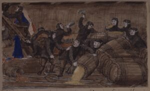 Selline vahetegemine põlistas mitmeid koloniaalmüüte: esiteks absurdset kujutelma Taani kolonialismi heatahtlikkusest, retoorikat, mille järgi Skandinaavia kolonialism oleks just nagu olnud „mitte nii halb“ või „vähem karm“ kui teiste koloniaalrežiimide vägivald. Teiseks seadis konflikti väljataandamine Aaluti pildid uude tõlgendusraamistikku kui tõendid rassilistatud „õnnelikust inukist“, kes on leplik tegelane – kuulekas koloniaalalam – ja ei vaidlusta, ei sekku ega ammugi mitte ei hakka mässama. Kui Taani Rahvusmuuseum andis 1982. aastal oma Aaluti piltide kogu tagasi Gröönimaale, Nunatta Katersugaasiviale (Gröönimaa Rahvusmuuseumile), ei hõlmanud repatrieerimise tingimused Norrat. Neli aastakümmet hiljem on Aaluti „provokatiivsed“ pildid endiselt Oslos ja seetõttu kalaallitite seas vähe tuntud. Üks neist piltidest kujutab elavat stseeni kümnest kalaallitist ühe Euroopa laeva trümmis. Üks sorib reisikirstus, kahmates sinist kangast, sellal kui teine kribib üles mööda redelit, kangaslepp sabas. Kolmas kulistab klaaspudelist mingit jooki, võimalik, et veini, ülejäänud aga murravad innukalt lahti puust vaate, et näha, mis seal sees on. Üks meestest vehib kirvega. Veel kaks tükki mugivad kuivikuid või leiba. Päris taga vasakus servas piilub üksik tegelane välja redeli alt, heites meelt ümberringi sündiva laastamistöö üle. Maali keskmes on kolm kuju. Paremal irvitab üks mees, kallates põrandale vaadi sisu, tema kaaslane aga vaatab üllatusgrimassiga üles, kui teda segab kolmas inuk, kes toimuvat päris õigeks ei pea. Maali moraliseeriv toon on selge: keskne figuur, keda allkirjas on nimetatud ristinimega „Jêgût (Jehu)“, püüab ohjeldamatut laastamistööd tõkestada. Olles ise kristlane, võttis kunstnik Aalut oma usku tõsiselt, kuid suhtus ristiusku pööramata inuittide ajalukku ambivalentselt.[4] Hoolimata pildi koloniaalselt moraliseerivast toonist, teeb see siiski selgelt nähtavaks ka põliselanike vastuhaku ajaloo.