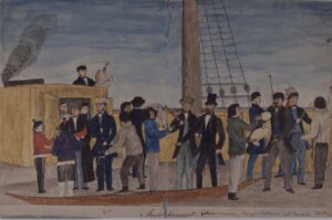 1776. aastal pani Taani Kuninglik Gröönimaa Kompanii Kalaallit Nunaati läänerannikul maksma oma monopoli. Kuulutades saare „suletud“ kolooniaks, püüdsid kompanii ja selle misjonid teha lõpu põliselanike kauplemisele mittetaanlastest võõrastega ning muuta, nagu Naja Dyrendom Graugaard on ütelnud, „mitmesuguste asjadega tegelev inuki kütt ühtainsat tegevusala viljelevaks grööni hülgekütiks“. Kaubavahetuses kehtestati inuittide tarbimisele drakoonilised kitsendused – kohvimüügipiirangud püsisid näiteks jõus kuni 1837. aastani. Pärast keeldude tühistamist panid Euroopa kolonistid kirja liialdatud lugusid abitute põliselanike kohvisõltuvusest. Just nendest kirjutistest tärkas sõltuvusdiskursus, mis ikka veel toetab rassilisi eelarvamusi Taani suhetes Kalaallit Nunaatiga. Aaluti pildil „Amerikamiut“ müüvad kalaallitid oma esemeid võõramaalastele omadel tingimustel, väljaspool misjonijaama ning hoolimata kaubakompanii reeglitest. Võib-olla sellepärast pidaski Rink seda pilti „taanlaste suhtes vaenulikuks“ stseeniks.