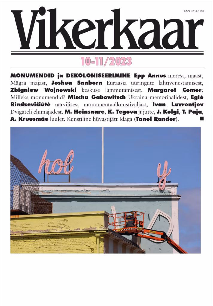MONUMENDID & DEKOLONISEERIMINE. Epp Annus merest, maast ja mägra majast, Joshua Sanborn Euraasia uuringute lahtivenestamisest, Zbigniew Wojnowski keskmeta geograafiast. Margaret Comer: Milleks monumendid? Mischa Gabowitsch Ukraina memoriaalidest, Eglė Rindzevičiūtė monumendipaanikast, Ivan Lavrentjev Dvigateli majast Stockmanni vastas. Kalle Käsperilt Dr Stockmanni vana uusversioon. Bruno Mölder mõistuse ümberlaadimisest, Mehis Heinsaare ja Katrin Tegova jutte, Jüri Kolgi ja Triin Paja luulet. Kunstiline hüvastijätt Idaga (Tanel Rander). Arvustuse all “Eesti novell 2023” (Kaupo Meiel), Katrin Lauri “Tunnistaja” (Tiina Kirss), Hargla “Heade mõrvade linn” (Siim Lill), Meelis Krafti “Tiuhkamäe” (Jaile Jürgens), Kristjan Haljaku “Elektra Domina” (Johan Haldna)