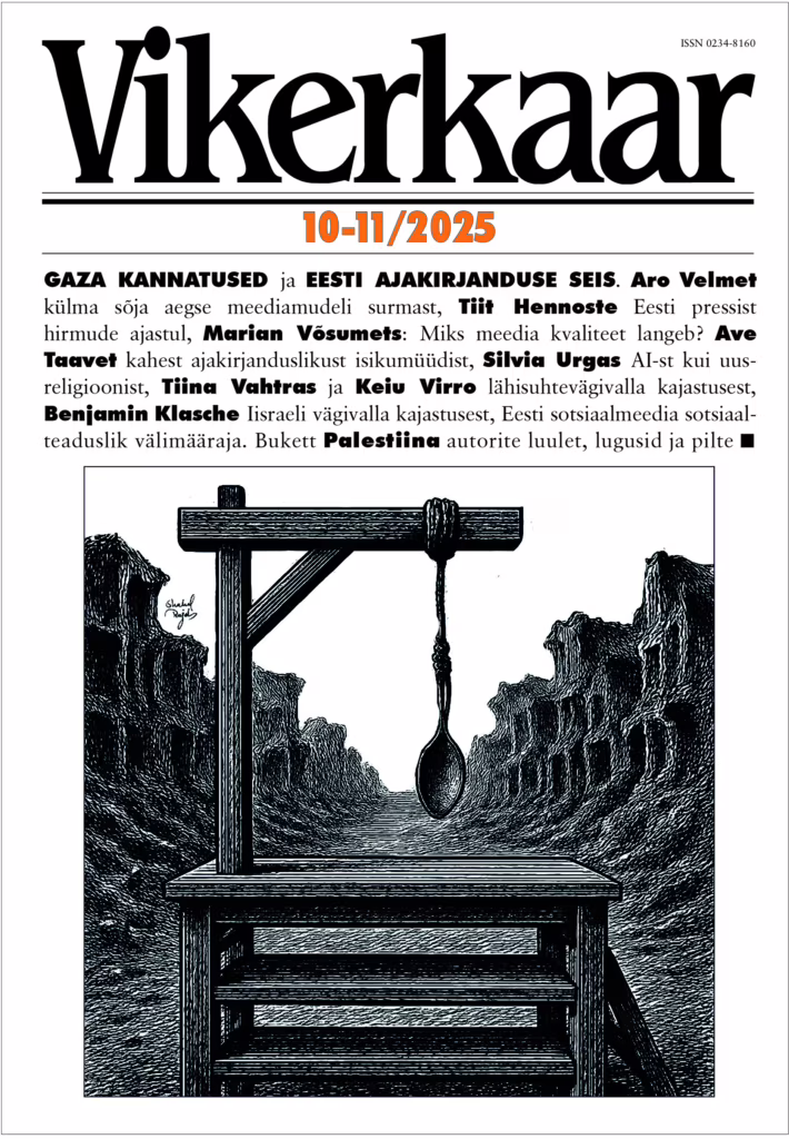 GAZA KANNATUSED ja AJAKIRJANDUSE SURMAMARSS. Aro Velmet külma sõja aegse meediamudeli surmast, Tiit Hennoste Eesti pressist hirmude ajastul, Marian Võsumets: Miks meedia kvaliteet langeb? Ave Taavet kahest ajakirjanduslikust isikumüüdist, Silvia Urgas AI-st kui uusreligioonist, Tiina Vahtras ja Keiu Virro lähisuhtevägivalla kajastusest, Benjamin Klasche Iisraeli vägivalla kajastusest. Eesti sotsiaalmeedia sotsiaalteaduslik välimääraja. Hazem Jamjoumi ja Heba Hayeki koostatud antoloogia Gaza luulet, lugusid ja pilte.