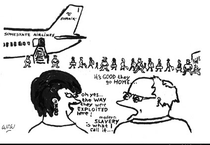Willem Weijtersi illustratsioon (2010)[33] Tekst kõlab: „. .kohustus inimkaubanduse ohvreid kaitsta ja abistada. .“ Kaks valget isikut silmitsevad migrantide rodu, kes asuvad lennukile kirjaga „Mingimaa lennuliinid“. Üks ütleb: „kui HEA, et nad KOJU lähevad…“ Teine vastab: „Oh jaa, mõtle, KUIDAS neid siin EKSPLUATEERITI! See on nüüdisaegne ORJUS, ma ütlen…“)