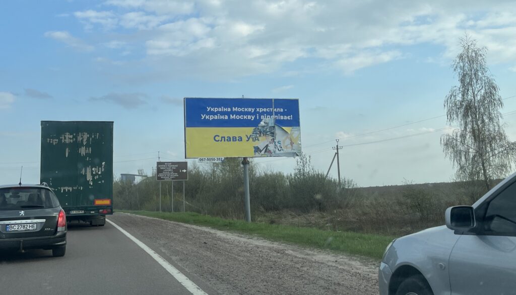 Püüdsin sõidu pealt üht-teist pildistada, suuri reklaamtahvleid. “Україна Москву хрестила, Україна Москву і відспіває!” Ühel oli kirjas ka: “Русский солдат! Уходи! Не стань убийцей!” Paar korda pidasin auto kinni, et pilte teha, aga siis hakkasin mõtlema, kui kahtlane see võib paista. Olgu, autol oli sõbraliku Eesti numbrimärk. Aga kust nad teavad, et ma pole diversant? Selline “omaparanoia” (vrd “omaviha”) saatis mind õigupoolest Poola piirist saati. Varasemastki veel: kui Lvivi vabatahtlike organisatsioon Основи свободи tegi mulle kinnituskirja, mille alusel toll oleks pidanud mind meditsiiniabiga läbi laskma, mõtlesin huviga, miks nad mind usaldavad. Olgu, Orysia tunneb mind päris pikka aega. Otsisin tema kaudu ukraina luuletajaid, olen tänapäeva ukrainlasi taga ajanud nii Vikerkaare (2014) kui nüüd siis ka Loomingu jaoks. Sinikollane märk oli mul mõnda aega FB profiilipildil, postitused peaksid meelsust näitama. Aga ikkagi. Kes ma selline olen, ah? Miks ma kahtlane ei tundu? Kuulsingi hiljem kunstnik Sofialt, et tema poiss-sõbra oli politsei Lvivis kinni pidanud, kuna too olla kahtlaselt kaua kahtlasi objekte pildistanud. Mind ei tülitanud tee ääres keegi, nautisin noort rohelist kevadet ja avaraid maastikke, aga suurema osa fotodest tegin siiski sõidu pealt. Kehv fotograaf nagu ma niigi olen.