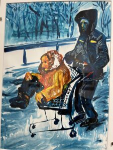 Sofia rääkis, et näitusmüükidest läheb enamasti 10% tuludest armeele. Ütles, et ukrainlased on nii väsinud sellest, et nad on šokeerivate, drastiliste, pöördeliste sündmuste epitsentris. Kui saaks veel kunagi elada rutiinset elu. Ta viis meid Armeenia kiriku kõrval Zelena Kanapa ehk rohelise diivani nimelisse galeriisse, kus oli viimast päeva avatud Lesja Babliaki näitus pealkirjaga “Sinikollane album”. Akvarellid olid tõesti sinikollase koloriidiga, ekspressionistlikud, autor oli maalinud need tuntuks saanud fotode või oma värskete mälupiltide põhjal. Purustatud sild, inimesed varjendis, vanaproua, kes ei saanud käia ja kelle keegi noormees (sugulane? väimees?) oli poekärus varju veeretanud.