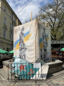 Tegelikult pole UNESCO maailmapärandi hulka arvatud kesklinn siiski päris endine: kirikute aknad on kinni kaetud, esimestel korrustel täidavad neid liivakotid. Keskväljakul, Ploštša Rõnokil, on raekoja neljas nurgas asuvad skulptuurid – Diana, Adonis, Neptun ja Amphitrite – kilesse mässitud ja seejärel peidetud metallkastidesse.