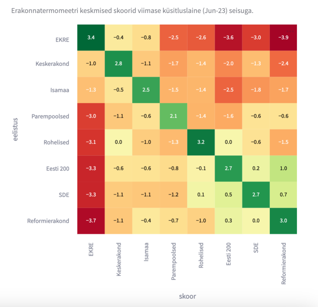 Tabel 1: Erakonna x toetajate tunded erakonna y osas. Kui üldiselt on erakondade toetajate tunded teiste erakondade osas võrdlemisi leiged, siis üheks erandiks on EKRE, kelle toetajatel on tugevad negatiivsed tunded nn “liberaalse bloki” (Ref+SDE+E200+Rohelised+Parempoolsed) osas ja vastupidi – ka “liberaalsete erakondade” toetajad EKREt just ei armasta.