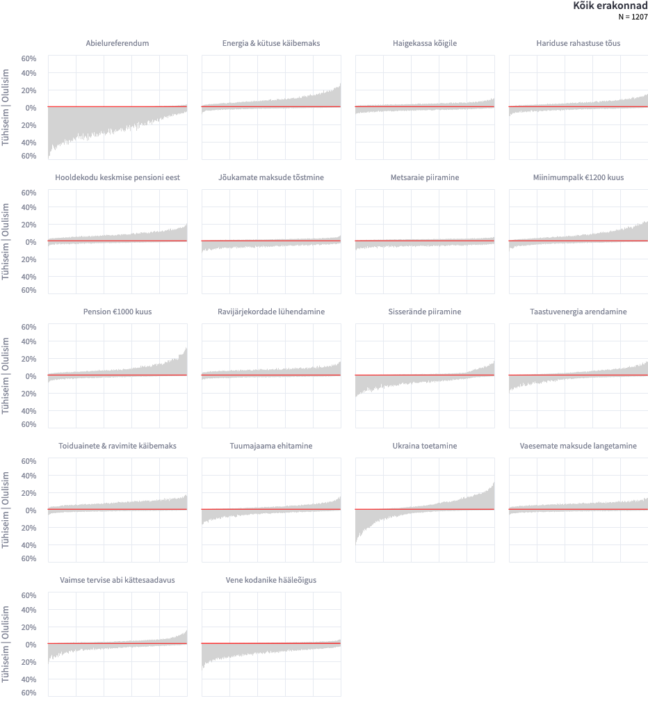Tabel 2: Teemade olulisus muude teemade kõrval. X-teljel on järjestatud konkreetsed vastajad, y-teljel on teema suhteline olulisus. Selgub, et abielureferendum ei huvita muude teemade kõrval eriti kedagi, küsimused nagu Ukraina toetamine on polariseerivad (osasid valijaid huvitab väga, osasid üldse mitte. Energia ja kütuse käibemaks jällegi pigem tõuseb muude teemade kõrval valijate jaoks esile.